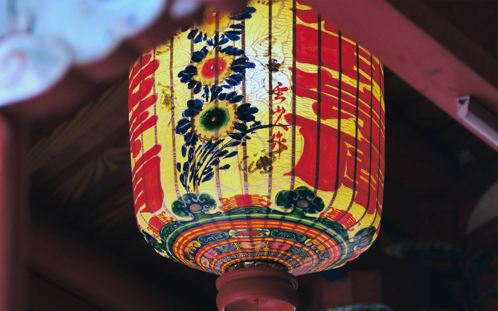 圖為台中林氏宗廟內燈籠,製作上從燈籠本體骨架至燈籠上紋樣彩繪均為司阜手工製作。以竹為工料,竹材使用薄刀,削制圓而狹長的細竹骨。紋樣彩繪上,亦有透過多層上色彩繪技法,成品如同漆器般的光澤。
